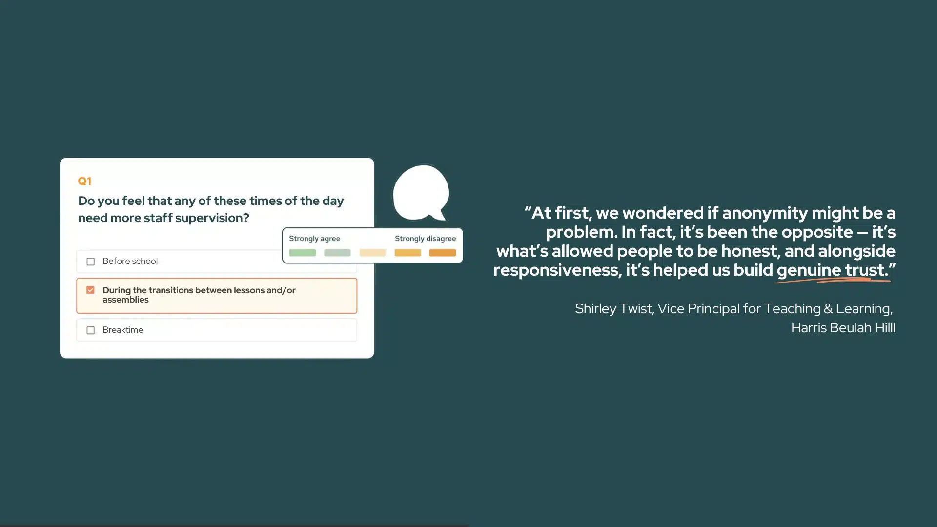 Vice Principal Shirley Twist, who oversees teaching and learning, led the transition to School Surveys, inspired by recommendations from Teacher Tapp and other Harris schools. For Shirley, the value was clear: expertly designed questions, rich comparative benchmarks, and a system that gave leaders a sharper picture of staff, student, and parent perspectives.