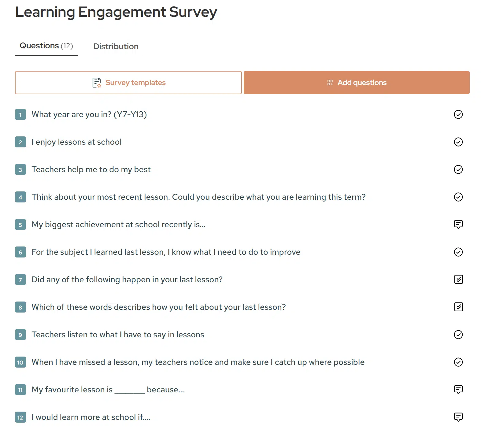A survey template with a focus on learning. Wider belonging questions about topics like safety, relationships and extra-curricular activities are also available.