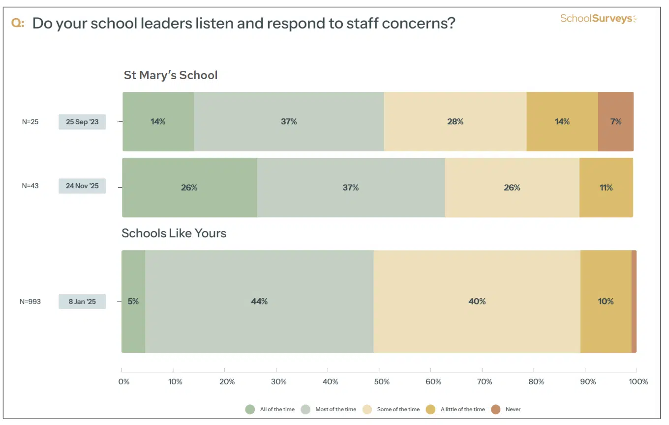 Ofsted are clear that staff voice matters, particularly in relation to workload, wellbeing and professional culture. The proportion of staff who feel leaders listen and respond offers a powerful proxy for psychological safety and organisational trust.
