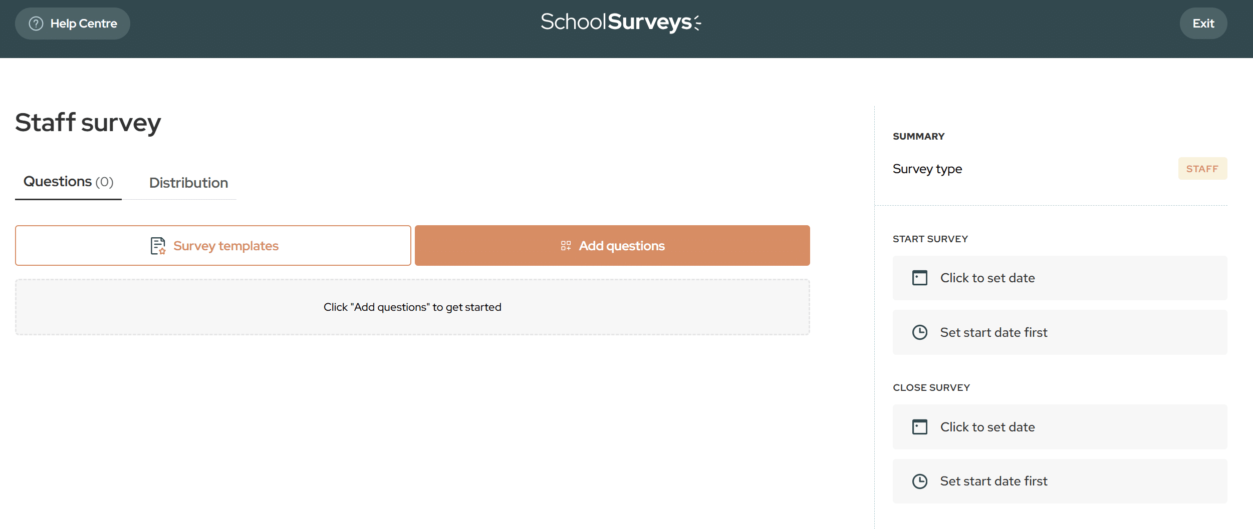 You will then be able to add the key information to build your survey: questions and dates. It is optional whether or not you add participants. These steps can be done in any order, and you will be prompted to add at least one question and the dates as a minimum.